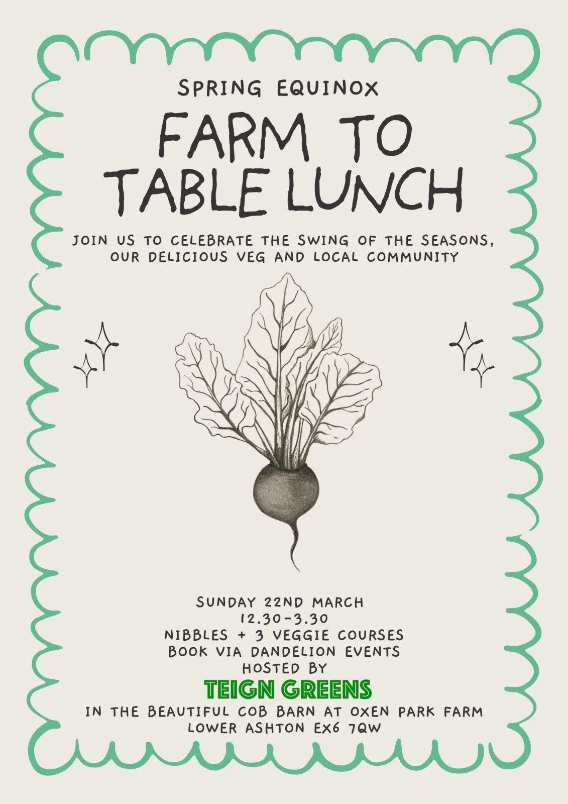 Enjoy nibbles followed by three thoughtfully prepared, veg-centred courses, lovingly cooked to showcase whatβs growing at this time of year. Ingredients will be grown by Teign Greens and sourced as locally as possible, including fruit and cider from our farm friends here at Oxen Park Farm, alongside cheeses from local makers. This will be a real celebration of local, seasonal produce and community.